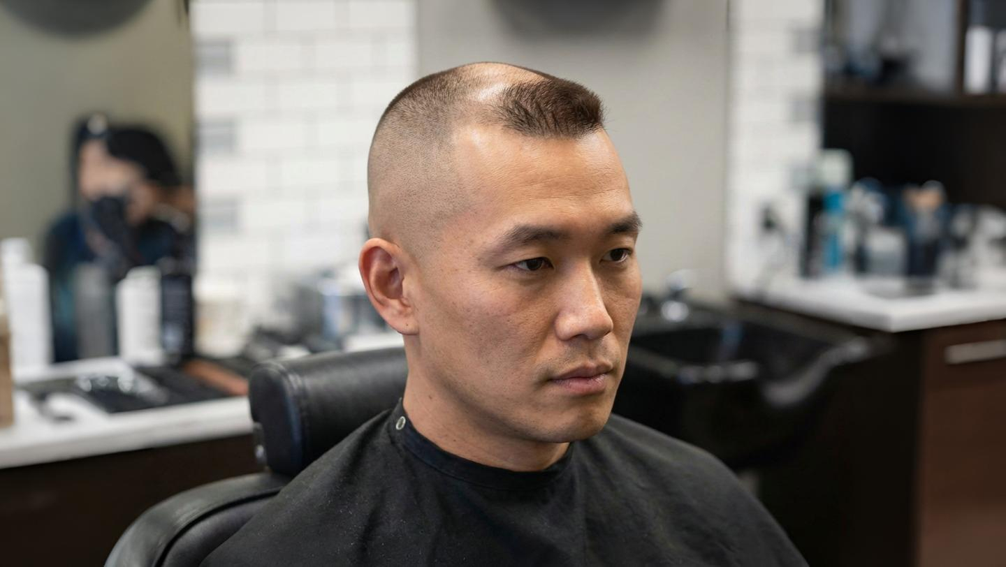 Почему это работает: при очень короткой длине разница между зоной с волосами и алопецией минимальна. Глаз не фиксируется на отсутствии волос, потому что их нигде нет в большом количестве.