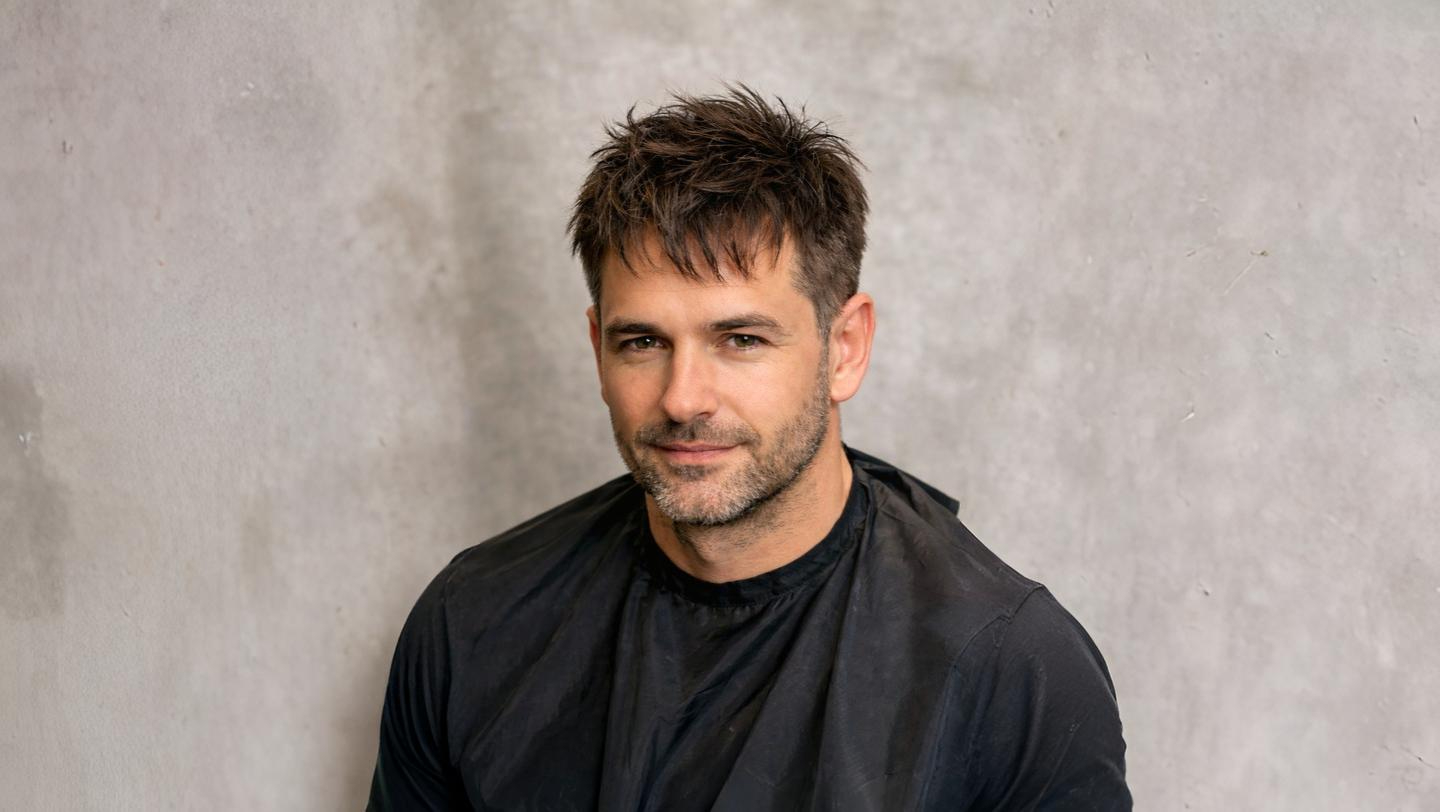 Парадоксально, но один из лучших способов скрыть облысение на лбу — это максимально короткая стрижка с лёгким сохранением текстуры.